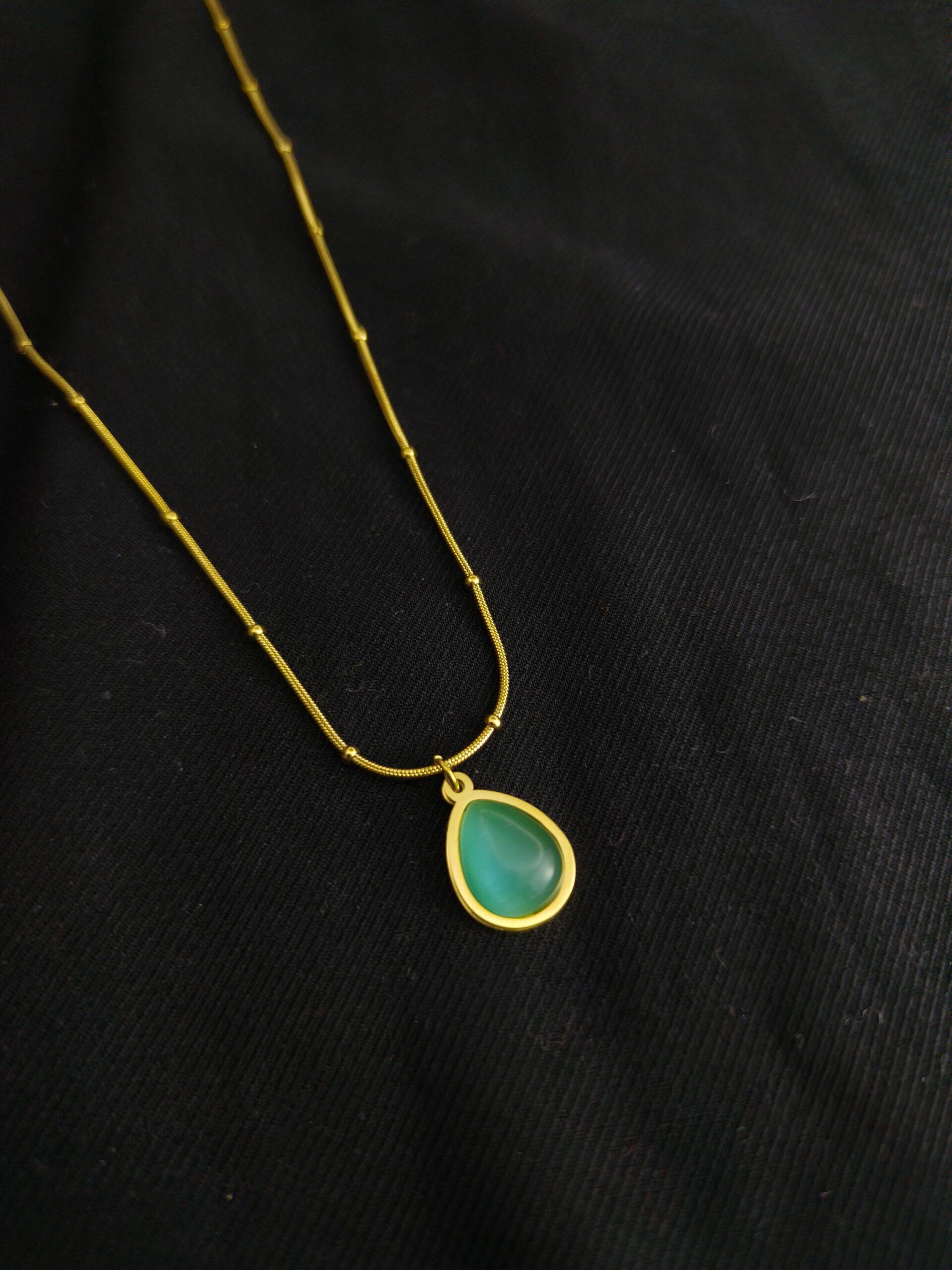 Noor Emerald Drop Pendant ek classy teardrop shape necklace hai jo premium gold-plated finish ke saath aata hai. Iska rich emerald green enamel center isse royal aur sophisticated look deta hai.